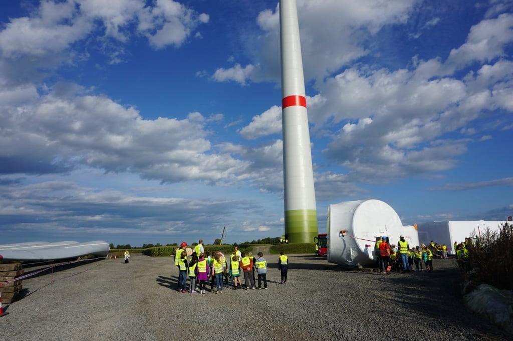 in Süstedt. Dank des Unternehmens Schierloh Engineering bekamen die Kinder die Möglichkeit sich die einzelnen Bauteile einer Windkraftanlage aus der Nähe anzuschauen und mehr über dessen Funktion