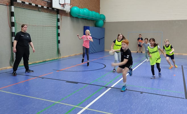 Am 24.11.2023 haben die Schülerinnen und Schüler der 3. und 4. Klassen am Handball-Grundschulaktionstag teilgenommen. In zwei Schulstunden konnten die Sportlerinnen und Sportler den "Hannibal-Pass" (Handball-Spielabzeichen des Deutschen Handballbundes) absolvieren, ihre persönlichen Fähigkeiten austesten und in verschiedene Spielformen ihren Teamgeist unter Beweis stellen. Und vor allem: Ganz viel Freude an Bewegung und für das Handballspielen entwickeln.