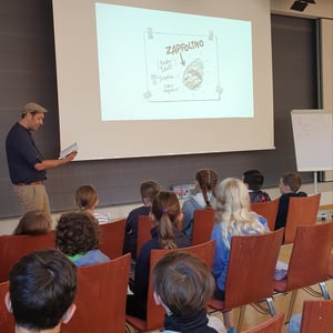Am heutigen Vormittag durften die vierten Klassen unserer Grundschule einen ganz besonderen Gast begrüßen: den Autor und Illustrator Michael Mantel. Mit im Gepäck hatte er ein spannendes Buch aus seiner Reihe „Die Unterholz-Ninjas“, aus dem er Auszüge mit viel Begeisterung und Humor vorlas.