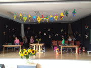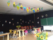 Währenddessen konnten sich Eltern, Verwandte und das Lehrerkollegium in einem vom Schulförderverein sehr hübsch dekorierten Vorraum des Forums stärken: Getränke, köstliches Süßes und Herzhaftes wurden gegen einen kleinen Obolus (der der Grundschule später ja wieder in anderer Form zugute kommt) angeboten.