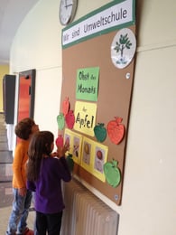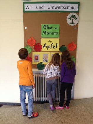 Unsere Umweltgruppe hatte wieder eine tolle Idee. Passend zu unserem Schulobstprogramm "küren" wir ab jetzt das "Obst des Monats". Los geht es in diesem Monat mit dem Apfel. An unserer Umweltwand in der Pausenhalle kann man allerlei Wissenswertes über dieses leckere und vitaminreiche Obst erfahren. Auf der Fensterbank kann man sich einige der zahlreichen Apfel-sorten mal etwas genauer anschauen.