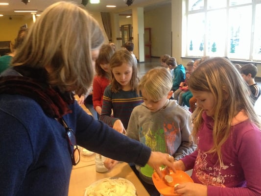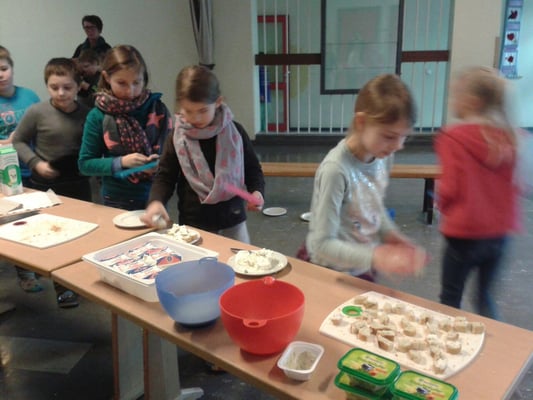 Alle Klassen durften in der Pausenhalle Kuh- und Ziegenmilchprodukte probieren. Dafür hatten alle Kinder einen Teller, einen Löffel und einen Becher mit. Manche haben sich erst nicht getraut, Ziegenkäse zu essen, aber dann fanden die meisten es doch lecker. Den Fruchtjoghurt aus Kuhmilch mochten aber fast alle sehr gerne! Leider gab es nur eine kleine Menge zum Probieren. Wenn man verschiedene Milchsorten gleich nacheinander probiert, schmeckt das echt verschieden. Für Kinder, die keine Milchprodukte vertragen, gab es Joghurt und Milch aus Sojabohnen. Das schmeckt so ähnlich.
