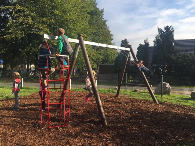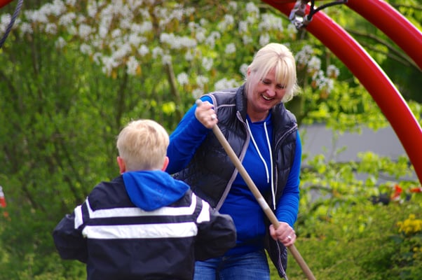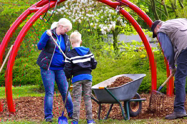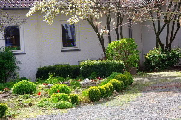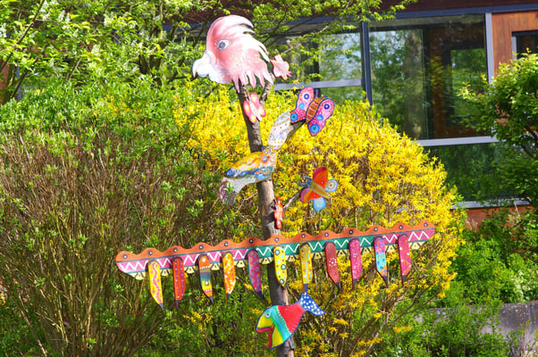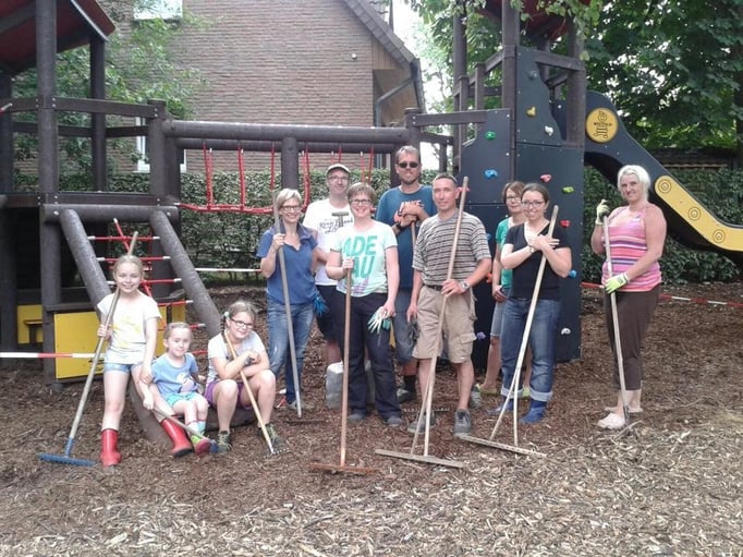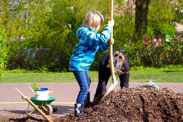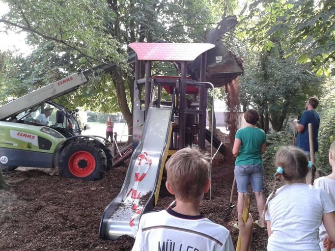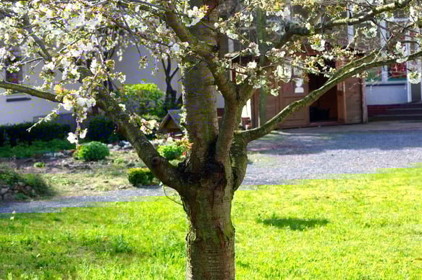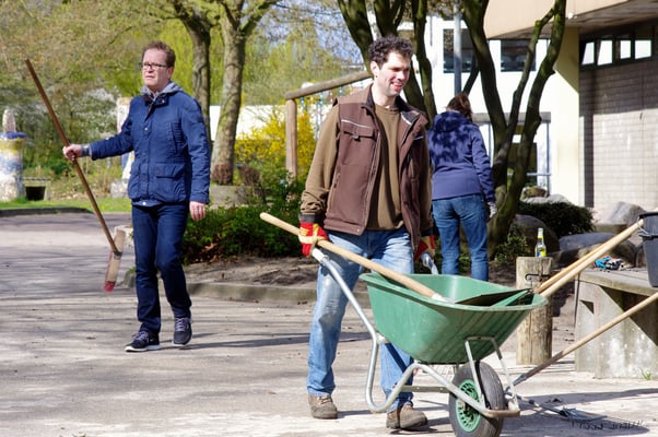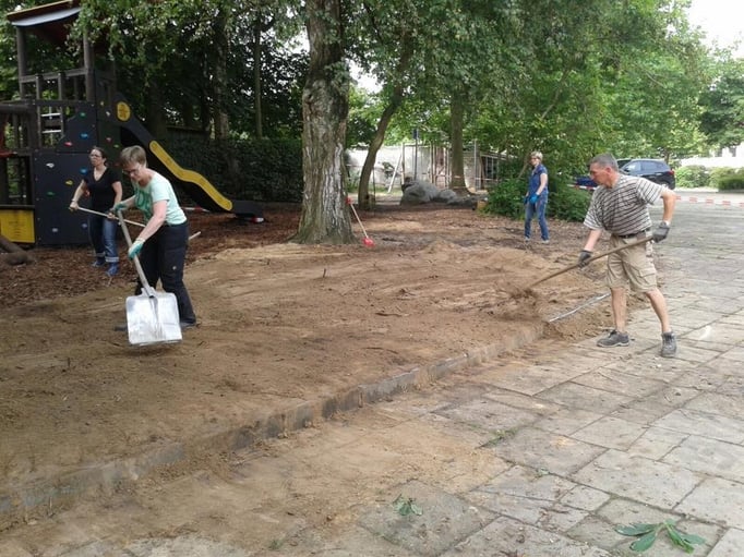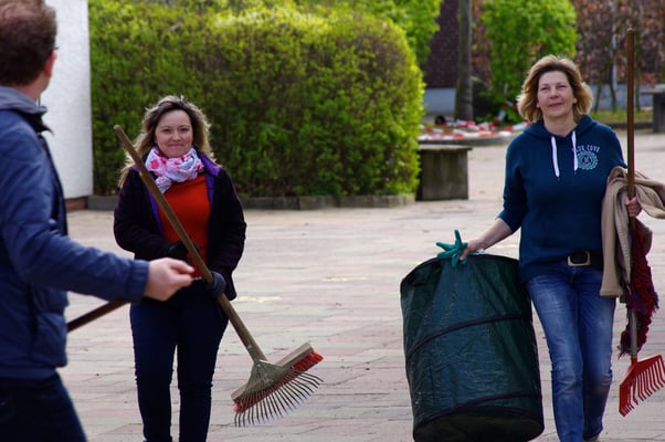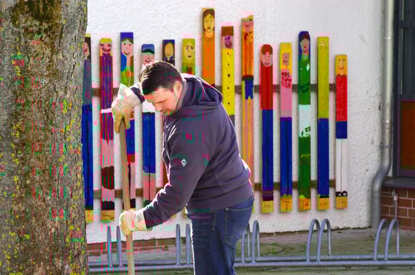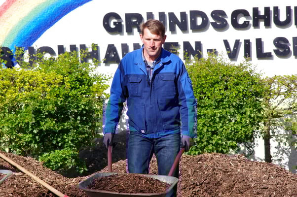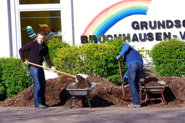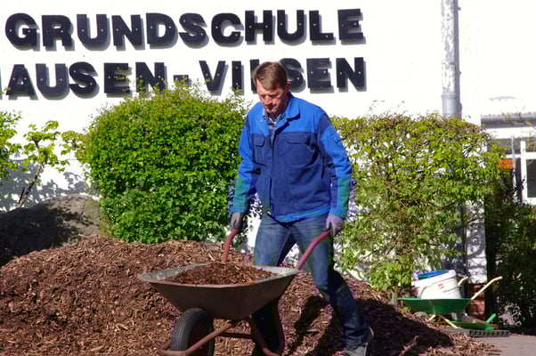 Einmal im Jahr wird der Schulhof von uns gepflegt und damit aus dem Winterschlaf erweckt. Es wird ordentlich durchgefegt, neuer Rindenmulch verteilt, sowie Bäume und Büsche beschnitten, damit sie wieder schön blühen können.