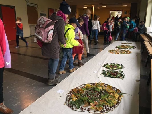 Die Klasse 4b gestaltete gemeinsam mit Frau Schmidt-Beck diese wunderschönen Herbstmandalas aus Laub, Eicheln, Beeren, Ästen, etc.,