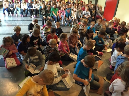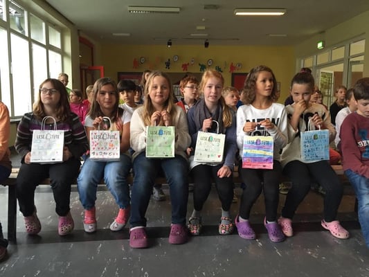 Am Mittwoch wurden die Leseanfänger aus dem ersten Jahrgang von ihren Paten aus dem 4. Jahrgang mit Lesetüten überrascht. Die Lesetüten wurden von ihren Paten liebevoll bemalt und nach einer Vorführung der Lese-AG aus Jahrgang 3 feierlich überreicht.