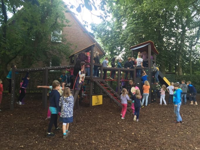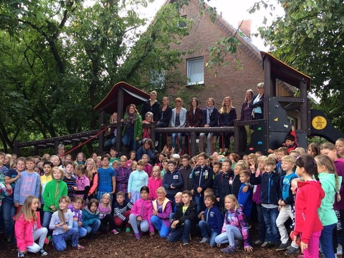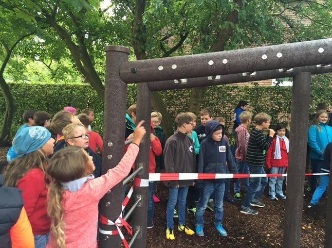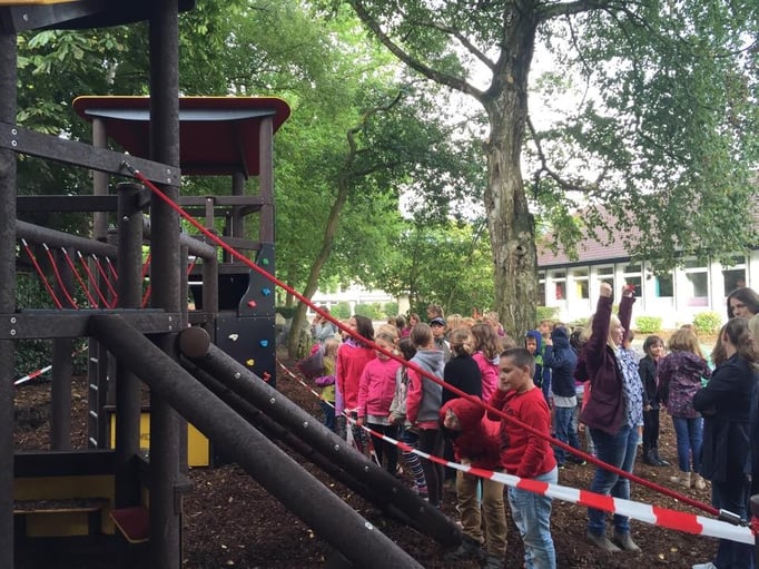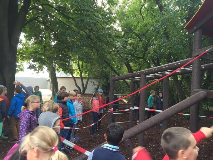In der ersten Hofpause am ersten Schultag wurden unsere neuen Spielgeräte feierlich eröffnet. Das Kollegium durfte nach dem Durchschneiden des Absperrbandes das Klettergerüst einweihen. Unter dem Jubel der Kinder wurde das Spielgerät in Beschlag genommen und zur Lehrerburg erklärt.